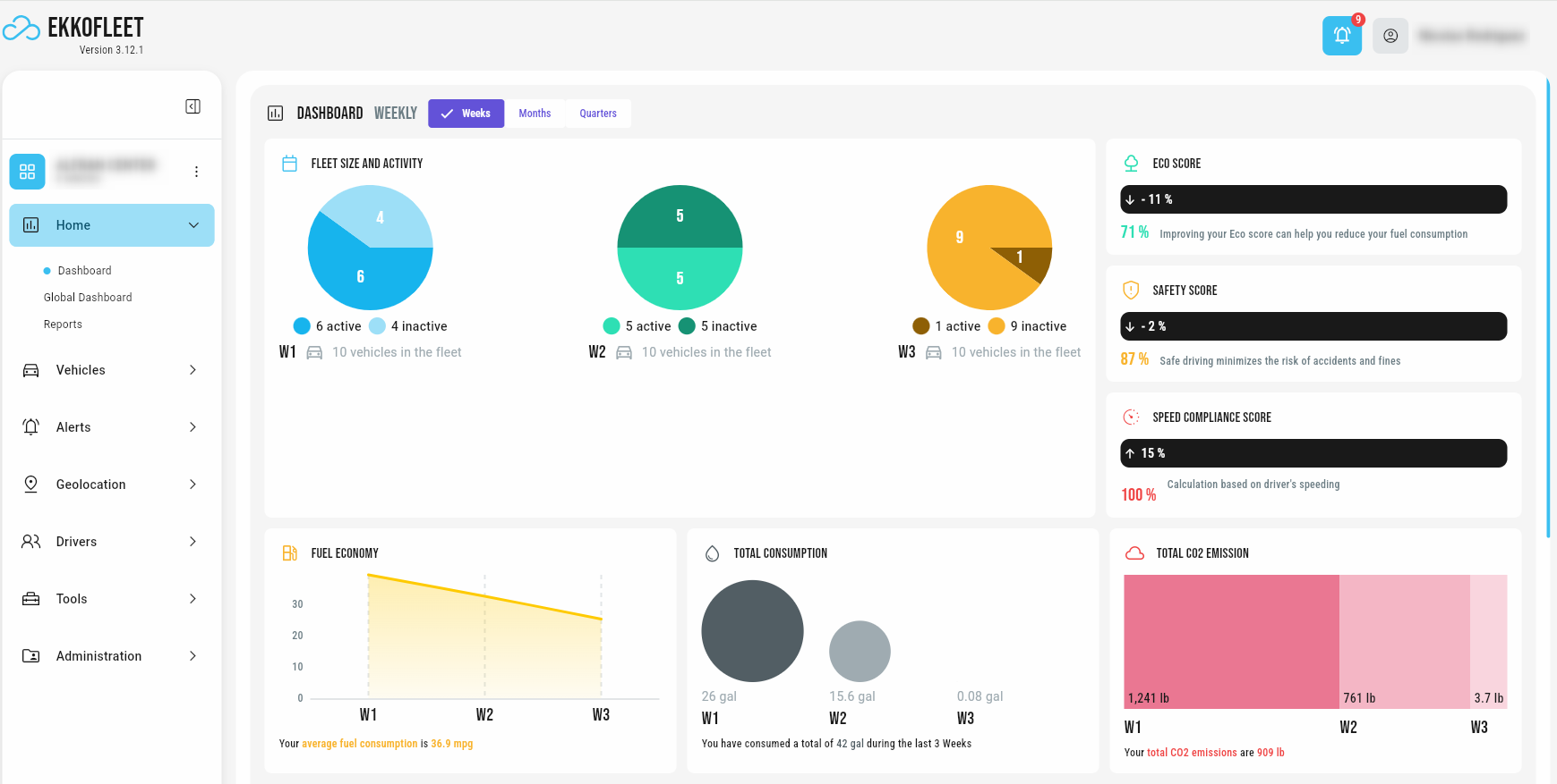The dashboard is your one-stop shop for a quick and comprehensive overview of your fleet's performance. It serves as your landing page after logging in and provides key insights and variations for the current period (the last 3 weeks, months, or quarters). This information helps you monitor overall fleet utilization, identify potential areas for improvement, and stay informed about critical alerts and vehicle status.